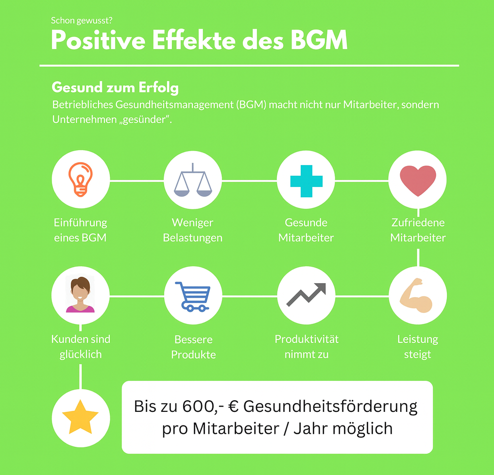 Ein starkes BGM ist ein entscheidender Erfolgsfaktor für moderne Unternehmen. Es sorgt für gesunde, motivierte Mitarbeitende – und damit für ein leistungsfähiges, stabiles und attraktives Unternehmen.